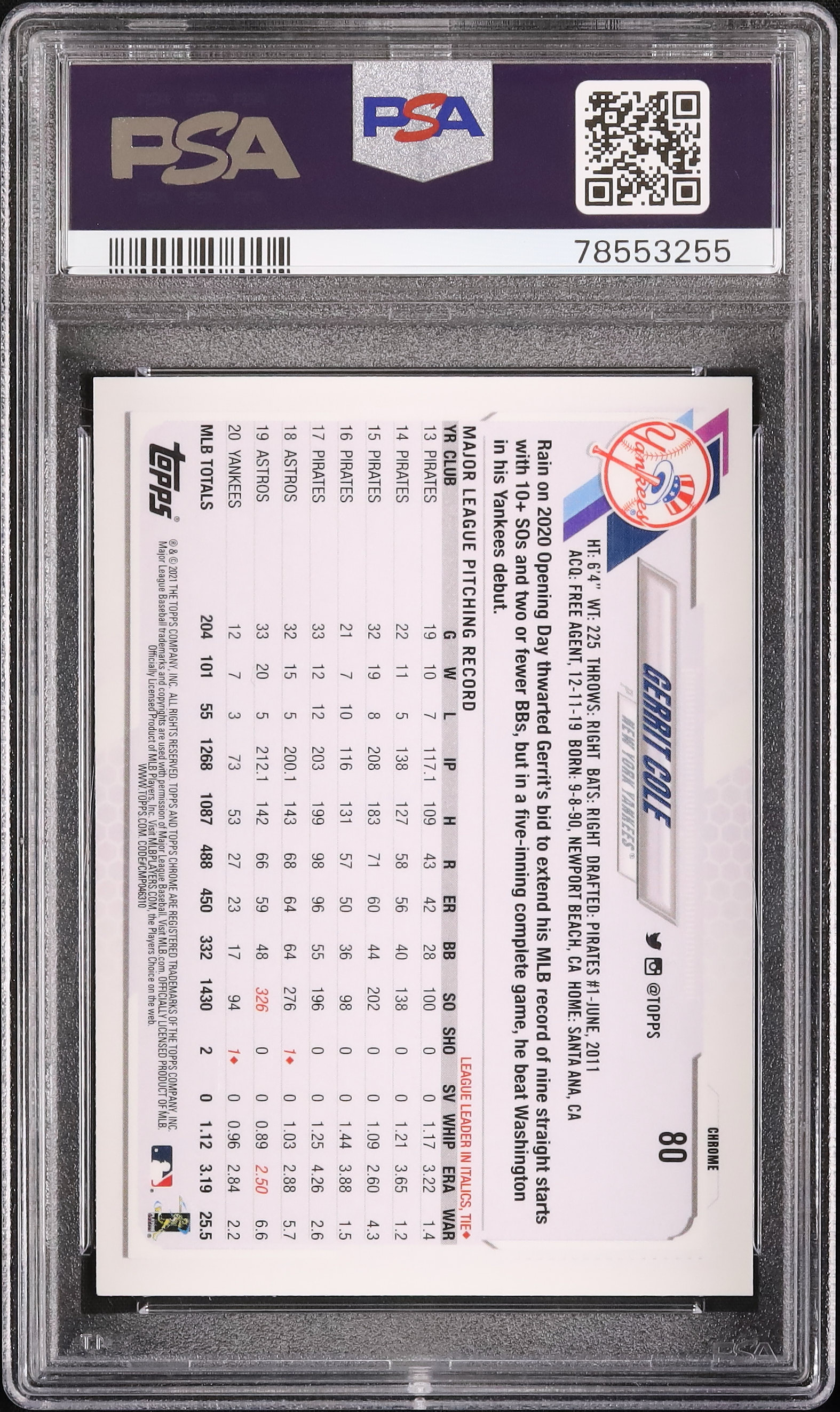 2021 Topps ゲリット・コール #80 Xフラクター クローム PSA 9