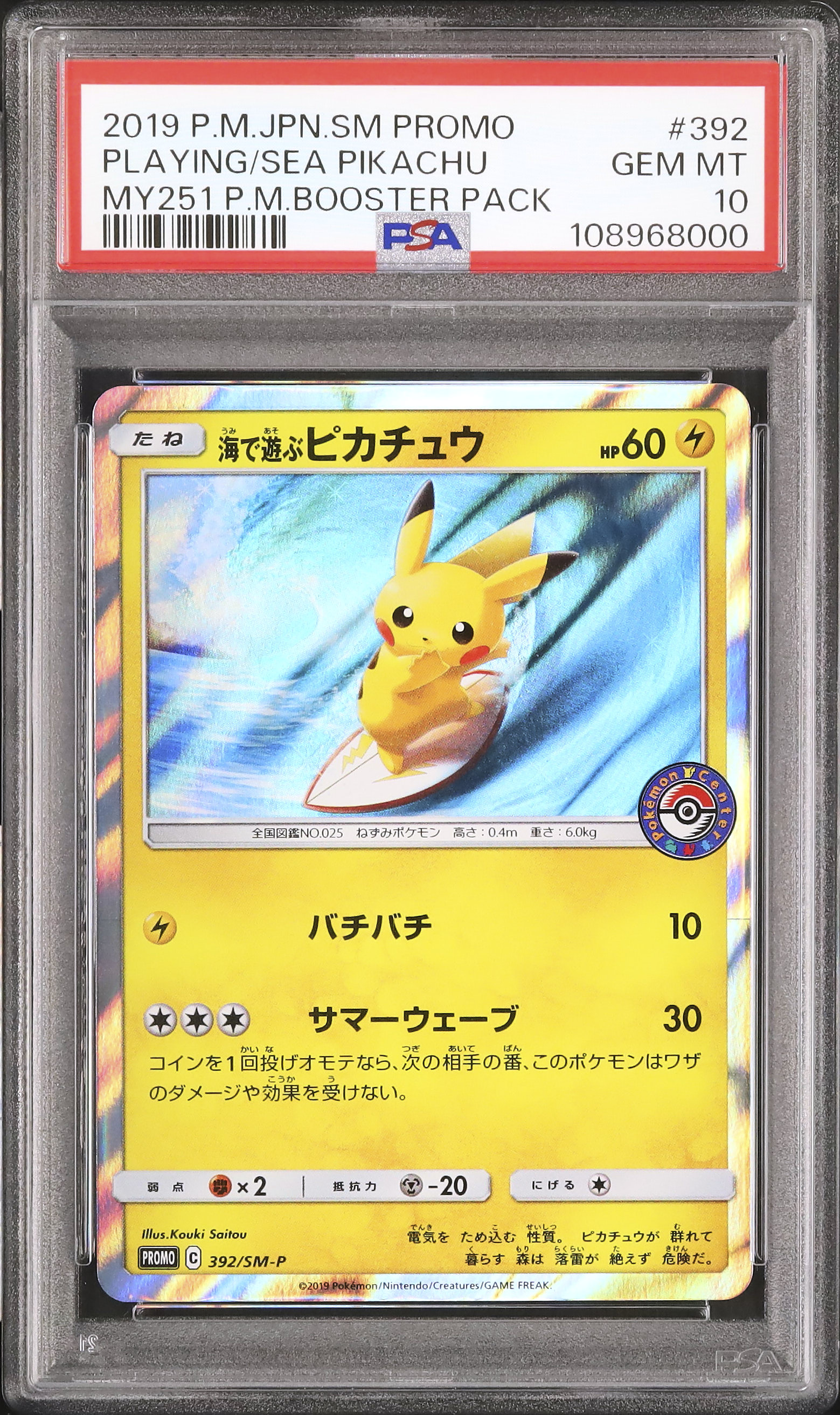2019 Pokemon Japanese Playing in the Sea Pikachu Promo My251 #392/SM-P PSA 10