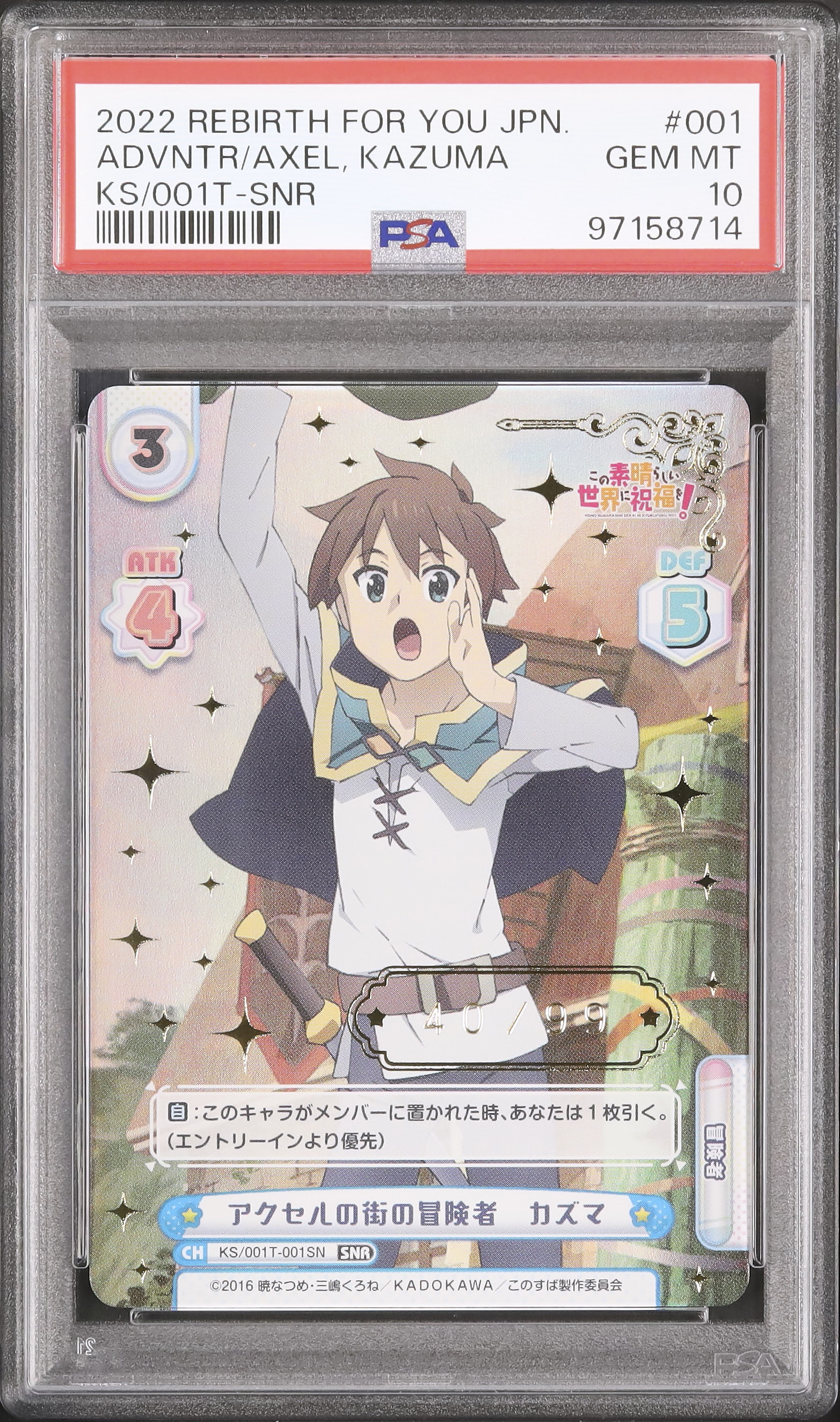 2022 Rebirth for you Japanese Kazuma, Adventurer of Axel City SNR ED 40/99 Konosuba #001 PSA 10